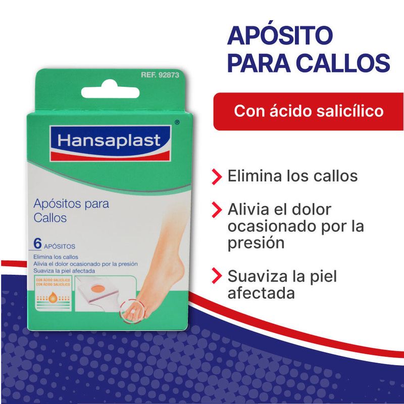 Los APOSITOS HANSAPLAST PARA CALLOS son una solución eficaz para aliviar y proteger los callos en tus pies. Cada caja contiene 6 unidades de estos apósitos especializados. Los apósitos están diseñados para proporcionar un alivio inmediato al reducir la presión y la fricción sobre los callos. Están hechos con material suave y cómodo que se adapta a la forma del pie para brindar comodidad durante todo el día. Además de aliviar el dolor y la molestia, los APOSITOS HANSAPLAST también ayudan a prevenir infecciones y a mantener una piel saludable en la zona afectada. Con esta caja de 6 unidades, tienes suficientes apósitos para un alivio duradero.