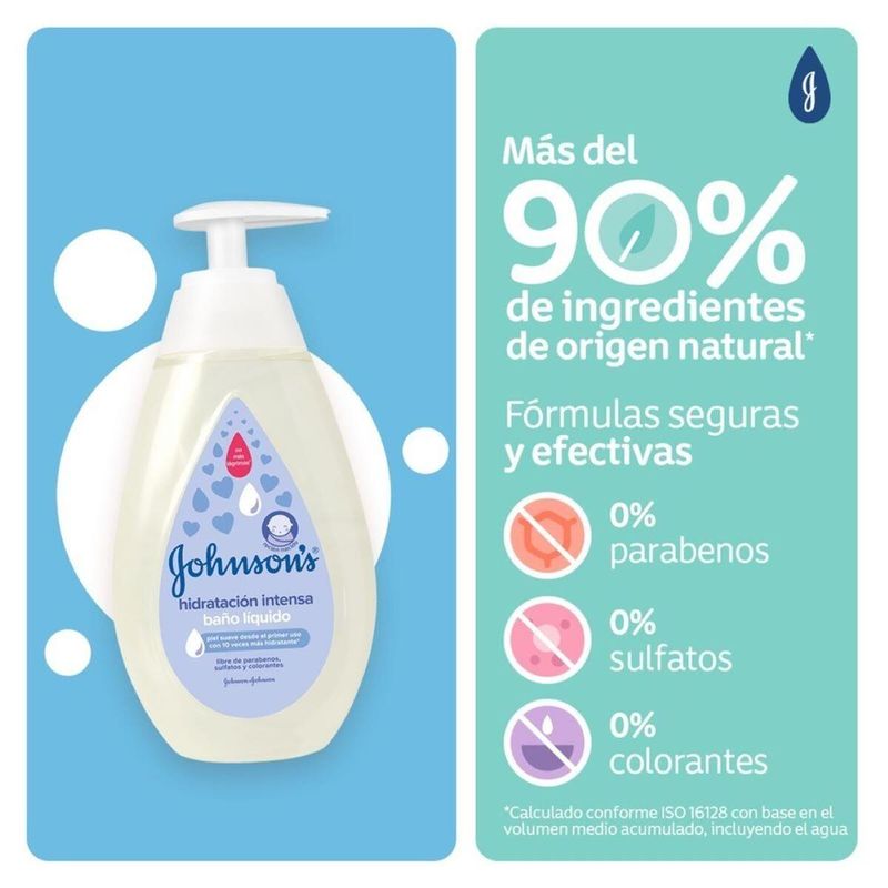 "Baño Líquido JOHNSON’S Hidratación Intensa limpia delicadamente, manteniendo la hidratación natural de la piel. Posee 10 veces más agentes hidratantes* y pH fisiológico, además de ser hipoalergénico y libre de colorantes, parabenos, sulfatos y ftalatos. Uso recomendado en niños desde los 6 meses de edad en adelante."