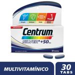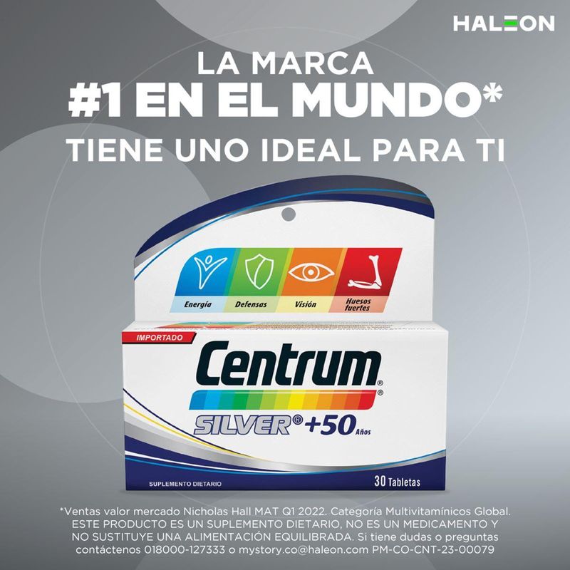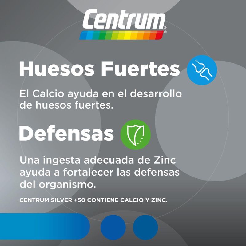 Suplemento vitamínico con fórmula especializada pensada para hombres y mujeres de 50 años en adelante, te brinda energía; la vitamina B2 (Riboflavina) es necesaria para la obtención de energía a partir de proteínas, grasas y carbohidratos. Defensas; Una ingesta adecuada de Zinc ayuda a fortalecer las defensas del organismo. Visión; La Vitamina A juega un papel fundamental en la visión, en el mantenimiento y regeneración de los huesos y dientes, en la reproducción y en el sistema inmunológico. Huesos fuertes; el calcio ayuda en el desarrollo de huesos y dientes fuertes. La Vitamina D ayuda al organismo a utilizar el Calcio y el Fósforo. Centrum Silver Contiene Vitamina A, Zinc ,Vitamina D, Vitamina B2, Calcio, Hierro, Vitamina C , ESTE PRODUCTO ES UN SUPLEMENTO DIETARIO, NO ES UN MEDICAMENTO Y NO SUPLE UNA ALIMENTACIÓN EQUILIBRADA. Modo uso: Tome una tableta diaria
