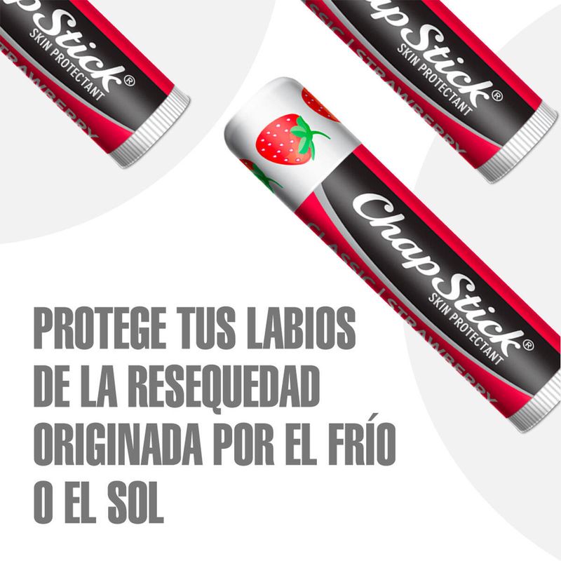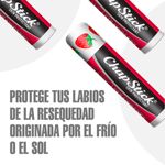 Chapstick Sabor Fresa 0.15 oz Protege tus labios de la resequedad originada por el frío o el sol. Puedes usarlo en todo momento para mantener tus labios suaves y humectados. X 1 Unid • Protector labial con sabor a fresa. • Humecta y protege tus labios. • Protege tus labios de la resequedad originada por el frío o el sol.