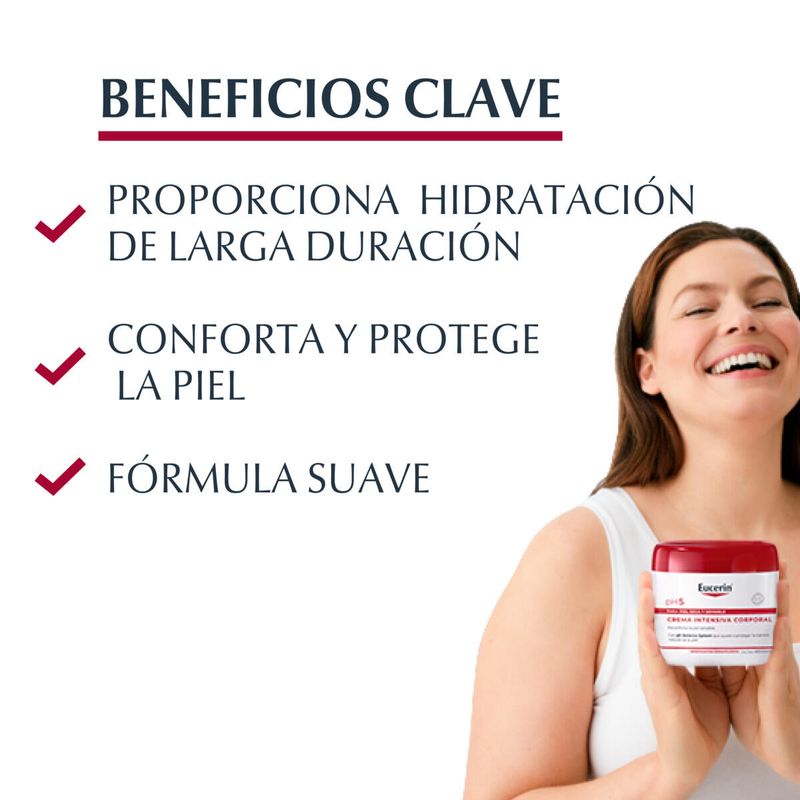 CREMA EUCERIN PH5 INTENSIVA FRASCO X 450 ML. Crema corporal de rápida absorción sin sensación grasosa, que ayuda a reducir la sensibilidad de la piel. La fórmula con la innovadora tecnología de hidrodispersión y Dexpantenol ha probado dermatológicamente que aumenta de manera significativa la hidratación de la superficie de la piel y disminuye la aspereza al tacto.