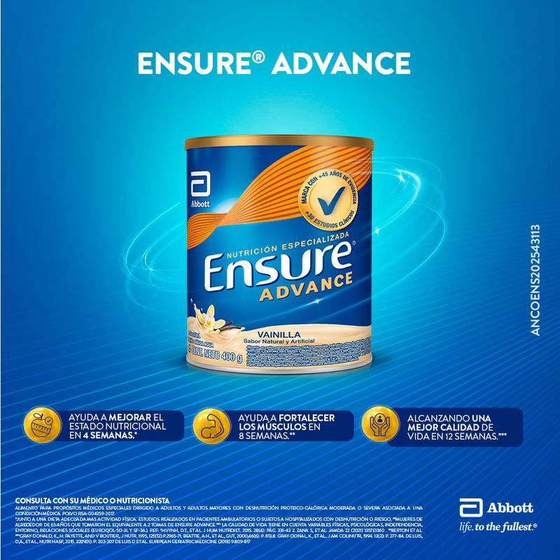 Ensure® Advance es ideal para adultos que requieran mantener o recuperar su masa muscular perdida por una condición de salud, y volver a llevar un estilo de vida activo. Formulado con CaHMB y proteína para los músculos, así como 28 vitaminas y minerales, incluyendo calcio y vitamina D, que apoyan la vitalidad fuerza y energía. También contiene omega 3 y 6 y no contiene grasas trans.