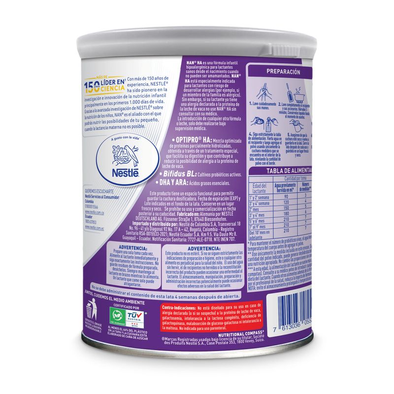 La FÓRMULA INFANTIL NAN HA 1 en una lata de 400 gramos es una fórmula especializada para bebés desde el nacimiento hasta los 6 meses de edad. Esta fórmula contiene proteínas hidrolizadas parcialmente, diseñadas para bebés con riesgo de alergias a la proteína de la leche de vaca. Proporciona los nutrientes esenciales necesarios para el crecimiento y desarrollo adecuado de tu bebé. Confía en NAN HA 1 para el bienestar nutricional de tu pequeño.