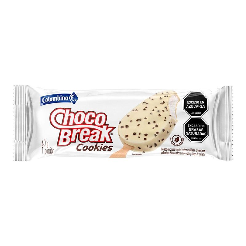 HELADO PALETA CHOCO BREAK & COOKIES X 60 GR. Paleta de crema sabor Cookies & Cream con cobertura sabor Chocolate Blanco con chips de galleta oscura. Disfrútalo como postre en cualquier momento del día.