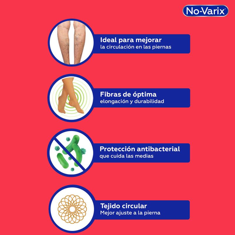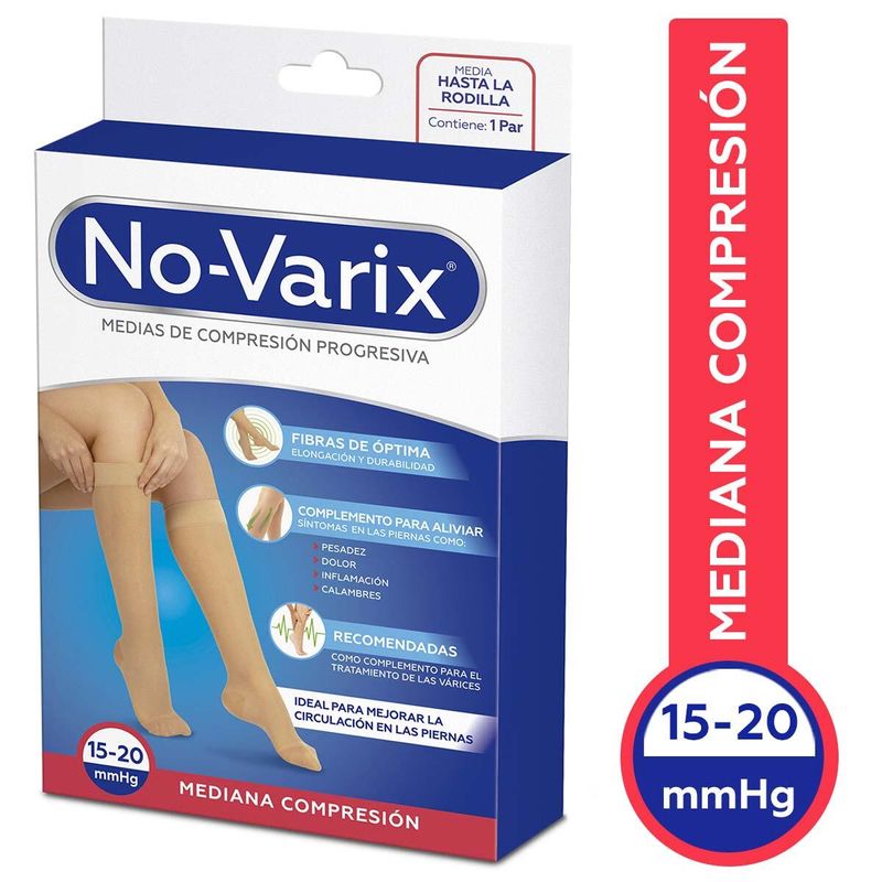 Medias no-varix dama 15-20 mediana compresion punta abierta beige talla m caja x 1 par son ideales para combinar con prendas ejecutivas y formales, son estéticas y elegantes, con apariencia velada y transparente. Las medias de mediana compresión 15-20 mmhg no-varix son recomendadas como complemento para el tratamiento de la insuficiencia venosa crónica, también son ideales para mejorar la circulación y aliviar síntomas en las piernas como: pesadez, dolor, inflamación y calambres. Su tejido circular con fibras de doble recubrimiento garantiza la compresión progresiva, elasticidad y durabilidad.