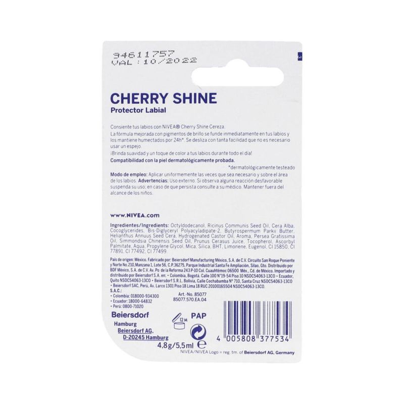 El Protector Labial Nivea Lip Care Fruity Shine se presenta en un envase de 4.8 gramos. Es un producto diseñado para hidratar y proteger los labios, brindando un toque de color y brillo. Este protector labial de Nivea contiene ingredientes nutritivos y humectantes, como aceite de almendra y manteca de karité, que ayudan a mantener los labios suaves y saludables. Además, proporciona una suave y agradable fragancia frutal. El Protector Labial Nivea Lip Care Fruity Shine es perfecto para mantener tus labios hidratados, protegidos y con un toque de brillo natural.