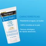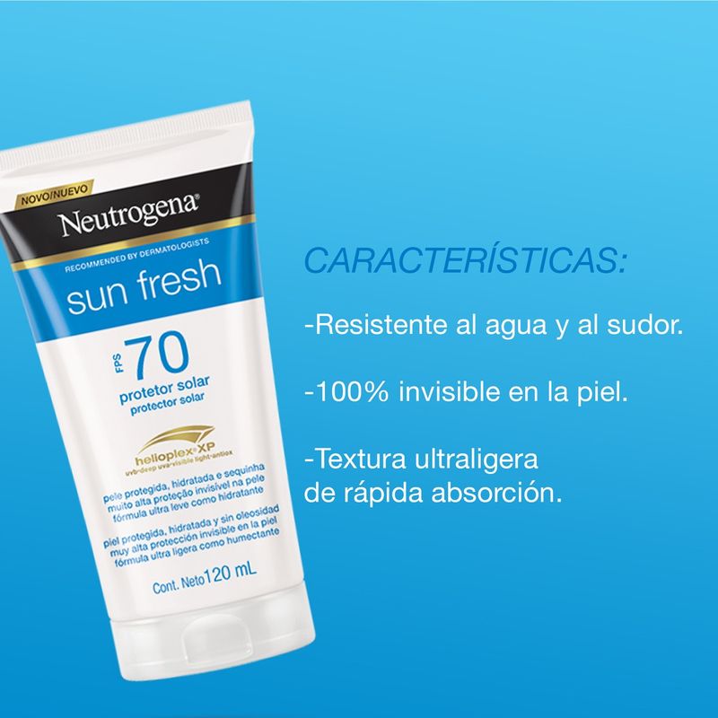 Neutrogena® Sun Fresh Protector Solar con su efectiva fórmula oil free o libre de grasa y textura ultra liviana resistente al agua, se absorbe rápidamente, dejándote una sensación suave y ligera al tacto. Sus dos presentaciones con FPS 50 y FPS 70 te brindan una mayor e inmediata protección contra los nocivos rayos UVA y UVB tanto en tu cuerpo como en tu rostro. Envío a domicilio a nivel nacional. Pide online al mejor precio.