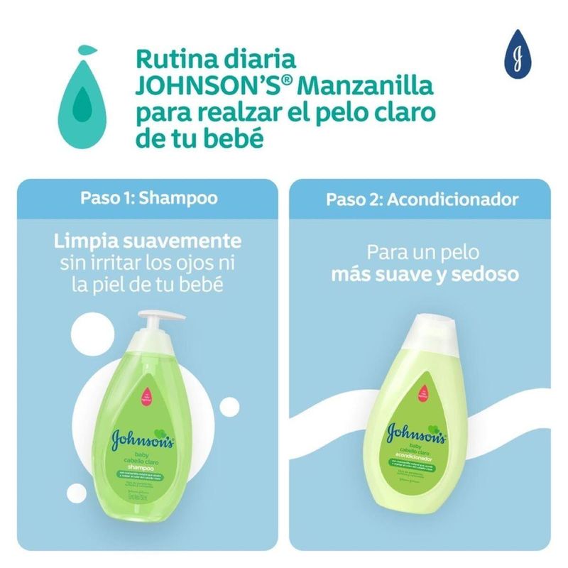 Shampoo JOHNSON'S® Manzanilla posee manzanilla natural, que ayuda a realzar el color del pelo claro. Limpia suavemente y protege el pelo y cuero cabelludo del bebé. Desarrollado con ingredientes de origen natural. Tiene pH fisiológico, es hipoalergénico y libre de colorantes, parabenos, sulfatos y ftalatos.
