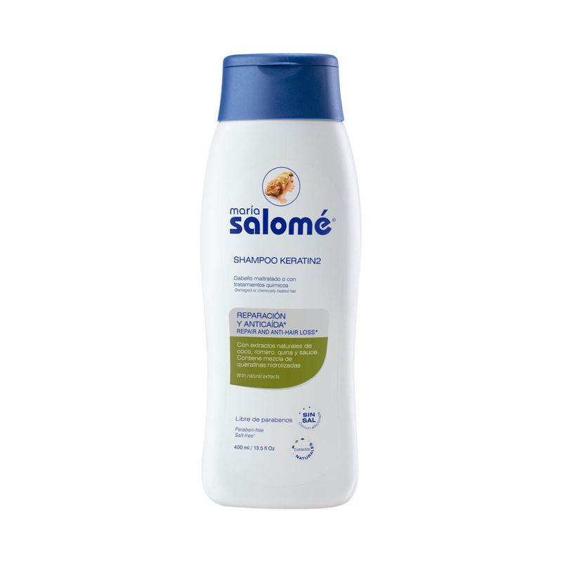Este es un producto cosmético, no posee acciones terapéuticas. El Shampoo Keratin2 María Salomé® repara la fibra capilar de los daños causados por tratamientos químicos (tintura, alisado o decoloración). Mantiene en buen estado el cuero cabelludo y disminuye la caída del cabello. *Acción anticaída por causas no asociadas a enfermedades.