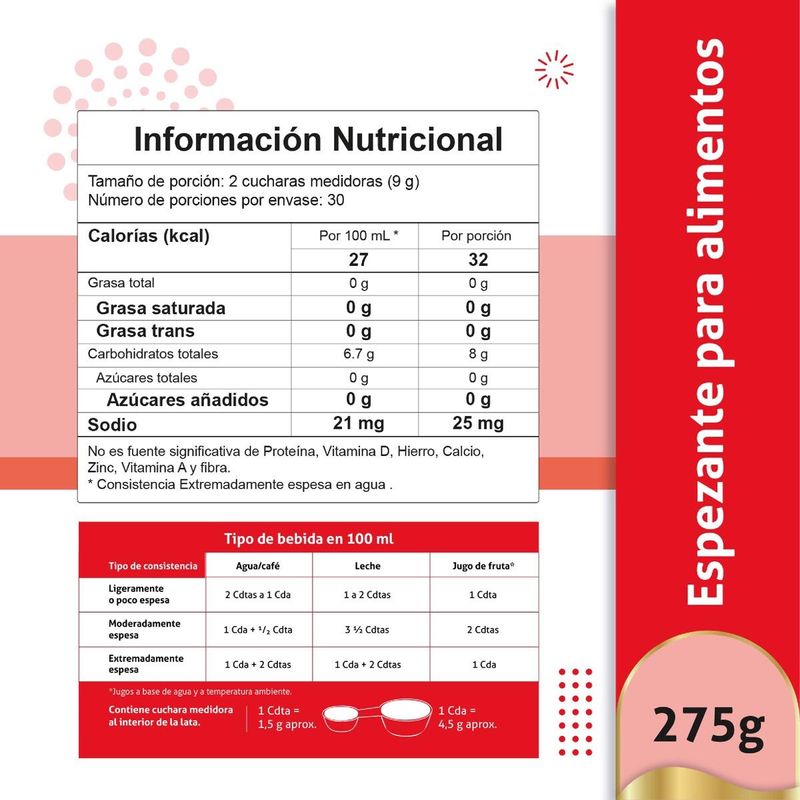 Conserva el sabor de los alimentos. Proporciona textura y apariencia agradable. No modifica el sabor de los alimentos. Mantiene la consistencia deseada y no se modifica con el tiempo.Es un módulo de carbohidratos para personas con disfagia o que requieren modificar la consistencia de los alimentos.