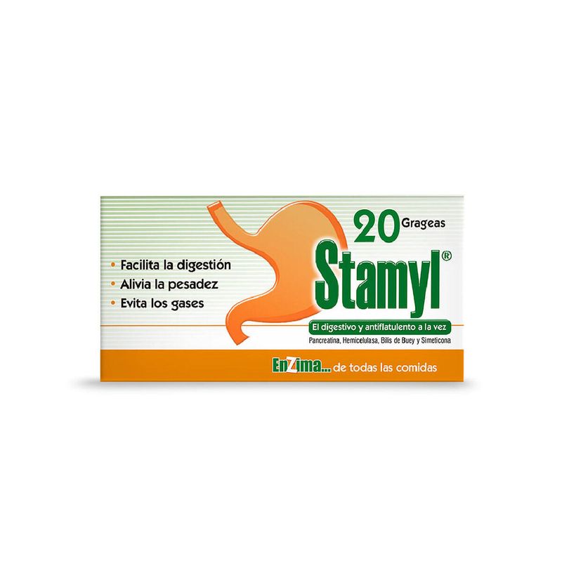 Stamyl Caja x 20 Tabl alivia los trastornos digestivos producidos por insuficiencia pancreática: Pancreatitis crónica, fibrosis pancreática y pospancreatectomía, estímulo químico en la gastroenteritis crónica, dispepsia fermentativa y de putrefacción, afecciones digestivas con asimilación deficiente de grasas y féculas. Flatulencia. Eliminación de gases para la radiografía abdominal.
