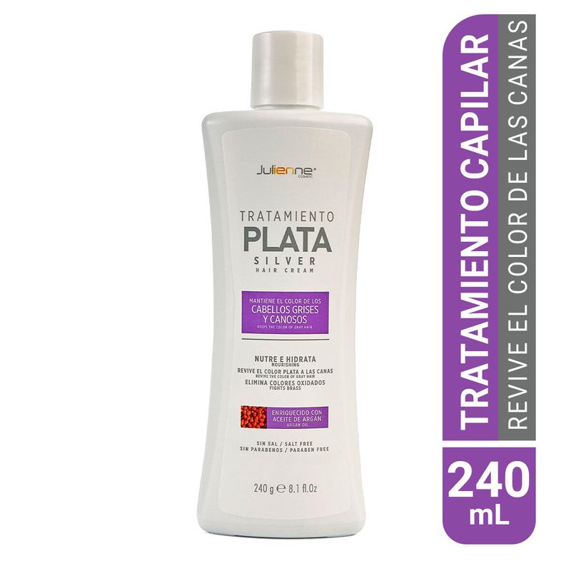 Descubre el poder del Tratamiento Capilar Julienne Plata, presentado en un frasco de 240 ml. Diseñado para revitalizar y fortalecer tu cabello, este tratamiento ofrece una fórmula enriquecida con ingredientes cuidadosamente seleccionados. Julienne Plata busca restaurar la salud capilar, aportando brillo y vitalidad. Con su aplicación sencilla y efectiva, este tratamiento es ideal para mejorar la apariencia y la textura de tu cabello. Dale a tu melena el cuidado que se merece con el Tratamiento Capilar Julienne Plata.