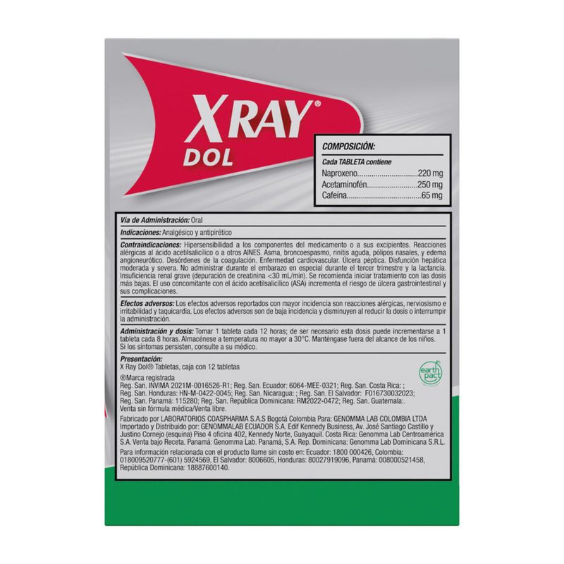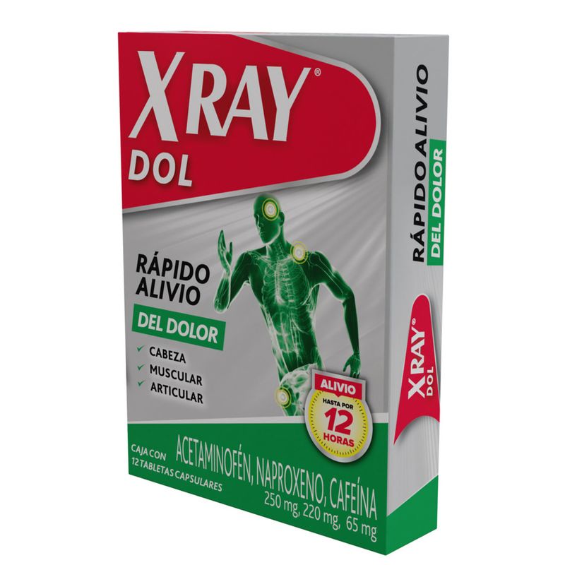 XRAY DOL es un medicamento analgésico y antiinflamatorio indicado para el alivio del dolor leve a moderado, como dolores de cabeza, dolores musculares, dolores menstruales, dolores dentales y de la artritis.Es importante seguir las indicaciones del médico y la dosificación adecuada según la edad y las condiciones de salud de cada persona.